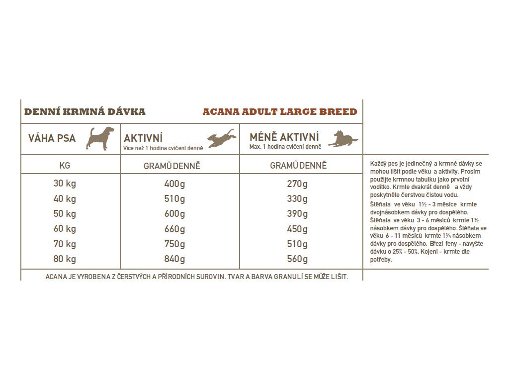 Připravováno v našich oceňovaných kuchyních v kanadě. Acana adult large breed překypuje čerstvými místními surovinami včetně volně chovaných kuřat, vajec z hnízdních chovů, platýse loveného volně v přírodě a na slunci zrajícího ovoce a zeleniny – všechny suroviny dodávají výživu a chutnost a zajišťují tak vrcholovou kondici psů velkých plemen. Přečtěte si naše složení a věříme, že s námi budete souhlasit.