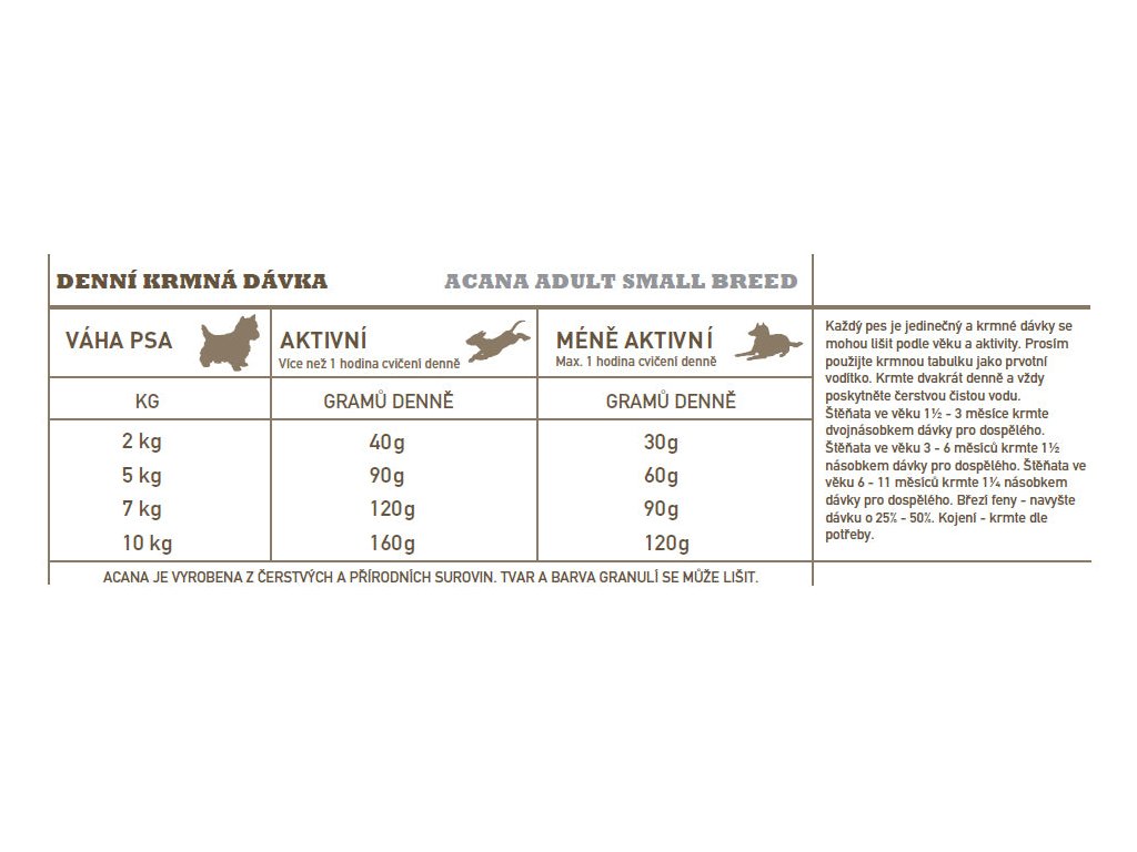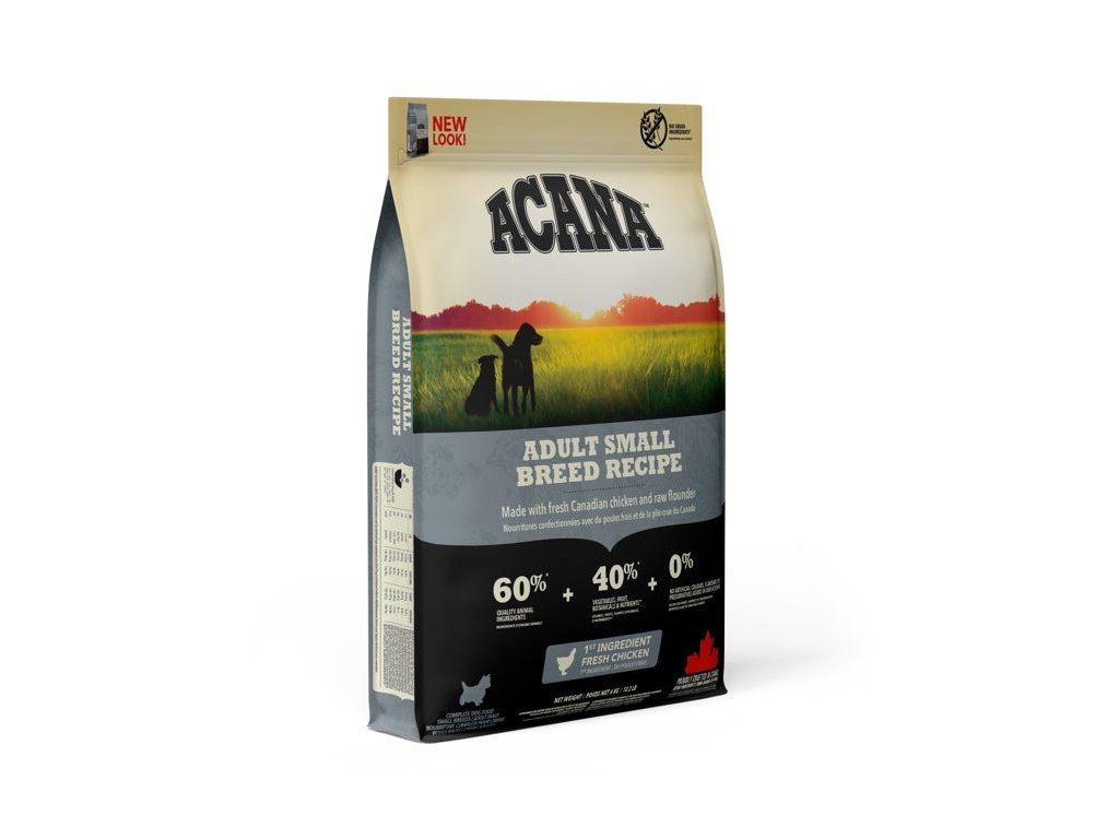 Připravováno v našich oceňovaných kuchyních v kanadě. Acana adult small breed překypuje čerstvými místními surovinami včetně volně chovaných kuřat, vajec z hnízdních chovů, platýse loveného volně v přírodě a na slunci zrajícího ovoce a zeleniny – všechny suroviny dodávají výživu a chutnost a zajišťují tak vrcholovou kondici psů malých plemen. Přečtěte si naše složení a věříme, že s námi budete souhlasit.