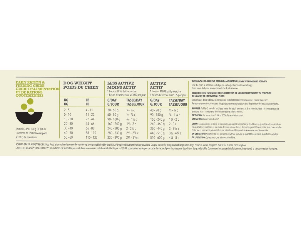 Acana grasslands obsahuje maso z volně chovaných jehňat, kachen a krůt, vejce z hnízdních chovů a ryby, vše dodávané čerstvé nebo syrové z našeho regionu v podílu celé kořisti, což dodává živiny přirozeně, bez potřeby dlouhého seznamu umělých doplňků. S nízkým obsahem sacharidů a vysokým obsahem živocišných proteinů pro dosažení vrcholové kondice.