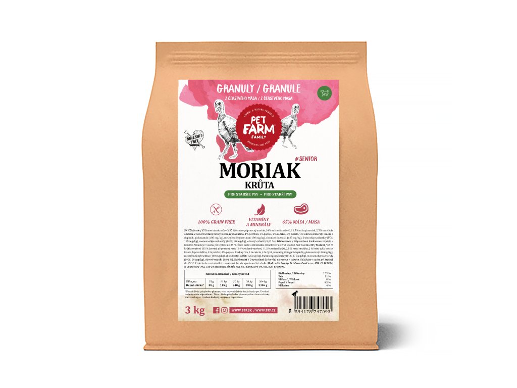 | Složení: | 65 % krůtí a vepřové (35 % čerstvě připravené krůtí , 14 % sušené vepřové , 11,5 % sušené krůtí , 2,5 % krůtí omáčka, 2 % krůtí tuk), batáty, fazole, řepná dužina, 4 % petržel, 4 % papája, 4 % kopřiva, 4 % cuketa, 4 % dýně, minerály, Omega 3 doplněk, Joint Pack (glukosamin 180 mg/kg, methylsulfonylmethan 180 mg/kg, chondroitin sulfát 125 mg/kg), fruktooligosacharidy (FOS, 175 mg/kg), mannanoligosacharidy (MOS, 50 mg/kg), olivový extrakt (0,01 %). |