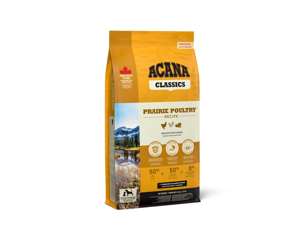 ACANA Classics PRAIRIE POULTRY RECIPE je kompletné krmivo pre psy všetkých vekových kategórií a plemien. Obsahuje mäso z voľne chovaných kurčiat a moriek a vajcia z hniezdných chovov. Má veľmi rozmanité a bohaté zloženie a nízku glykemickú záťaž (neobsahuje vysokoglykemické obilniny). Kvalitné živočíšne proteíny a omega 3 prispievajú k výbornej kondícii psa.