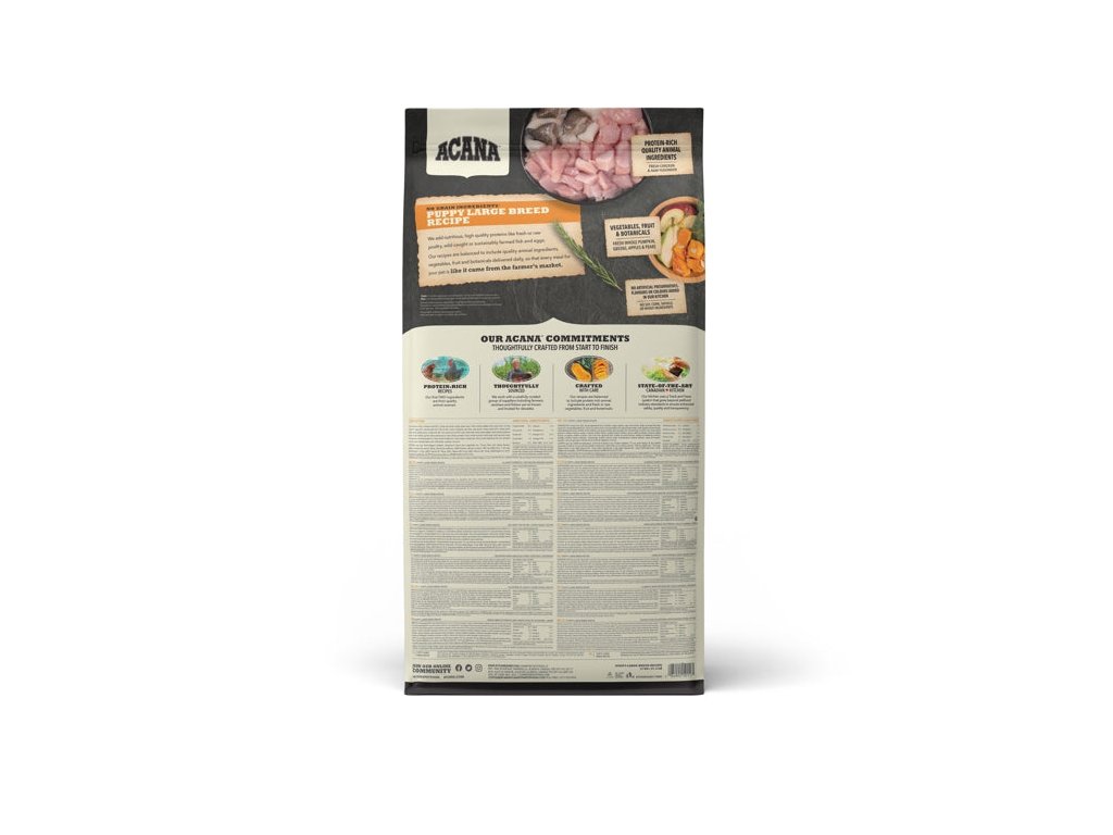 ACANA PUPPY LARGE BREED RECIPE je kompletné krmivo vhodné pre šteňatá všetkých plemien, ktoré v dospelosti vážia viac ako 25kg. Obsahuje voľne chované kurčatá, morky, vajcia a voľne lovené ryby. Krmivo je veľmi rozmanité a bohaté zloženie zaistí zdravý rast vášho šteniatka.