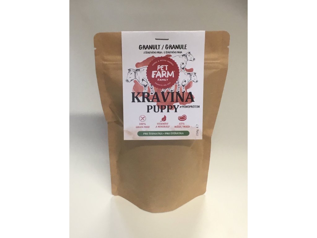 Kompletné jednodruhové krmivo pre psov. Granuly z hovädzieho Angus s nižším obsahom nasýtených tukov, bohaté na aminokyseliny, vitamíny a minerály. Zvýšený pomer bielkovín a tukov pre rast a prospievanie. Pridané omega-3 pre podporu kognitívneho a vizuálneho vývoja šteňaťa. So zmesou zeleniny na doplnenie vitamínov a podporu dobrého zažívania.